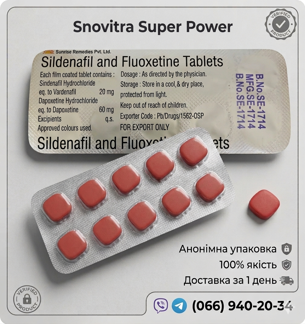 Snovitra Super Power — це комбінований препарат 2 в 1, призначений для еректильної дисфункції та передчасної еякуляції у чоловіків. До складу препарату входять дві активні речовини: варденафіл (20 мг) та дапоксетин (60 мг). Варденафіл сприяє поліпшенню кровообігу в статевому члені, що дозволяє досягти та підтримувати ерекцію під час сексуального збудження. Дапоксетин допомагає контролювати еякуляцію, подовжуючи час до її настання.