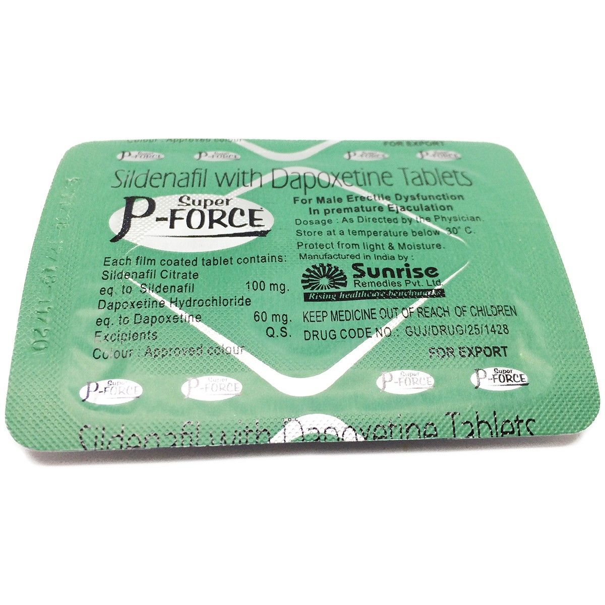 Super P Force — це комбінований препарат 2 в 1, призначений для еректильної дисфункції та передчасної еякуляції у чоловіків. Він містить дві активні речовини: силденафіл (100 мг) та дапоксетин (60 мг). Силденафіл сприяє розширенню кровоносних судин у статевому члені, що покращує кровообіг і допомагає досягти ерекції. Дапоксетин, у свою чергу, допомагає контролювати еякуляцію, затримуючи її настання.